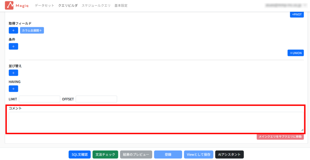Magiq便利機能 コメント欄機能 この記事のタイトルとURLをコピーする 概要 Magiqでは、メモや説明を残したい場合に活用できるコメント欄機能があります。コメント欄は、クエリ作成ページ下部にあります。 SQL文の途中にコメントを挟むことはできませんので、ご注意ください。
