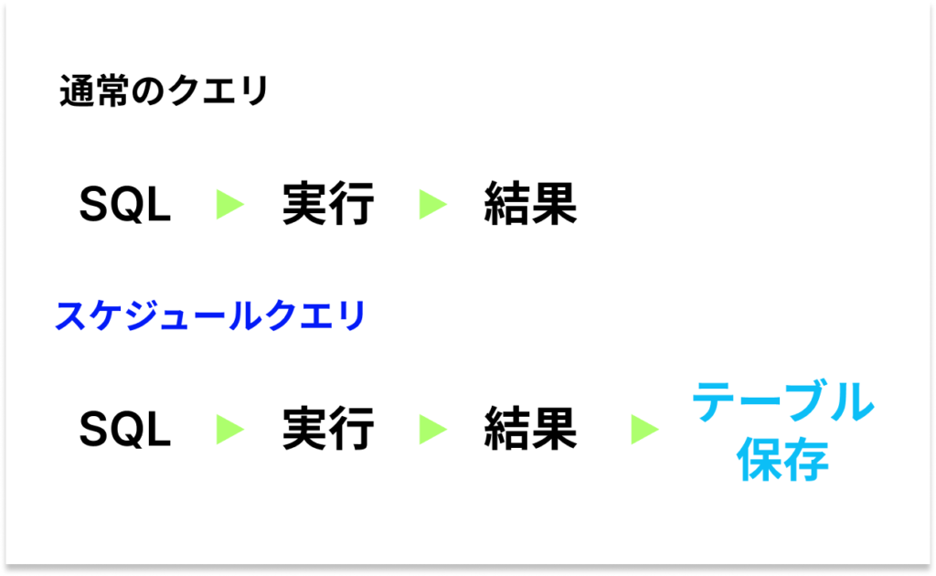 しかし、スケジュールクエリを使用すると、実行結果をテーブルとして保存できます。これにより、クエリを実行して得られたデータを後から簡単に利用できるようになります。