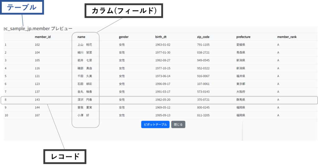 データは基本的に、二次元の表のような形で格納されているとイメージすることができます。データセットにおけるこの表のことを、テーブルと呼びます。画像は、Magiqのサンプル内にある会員情報テーブルです。