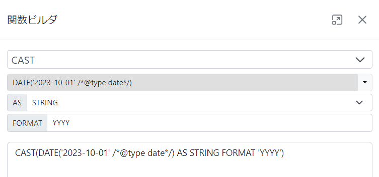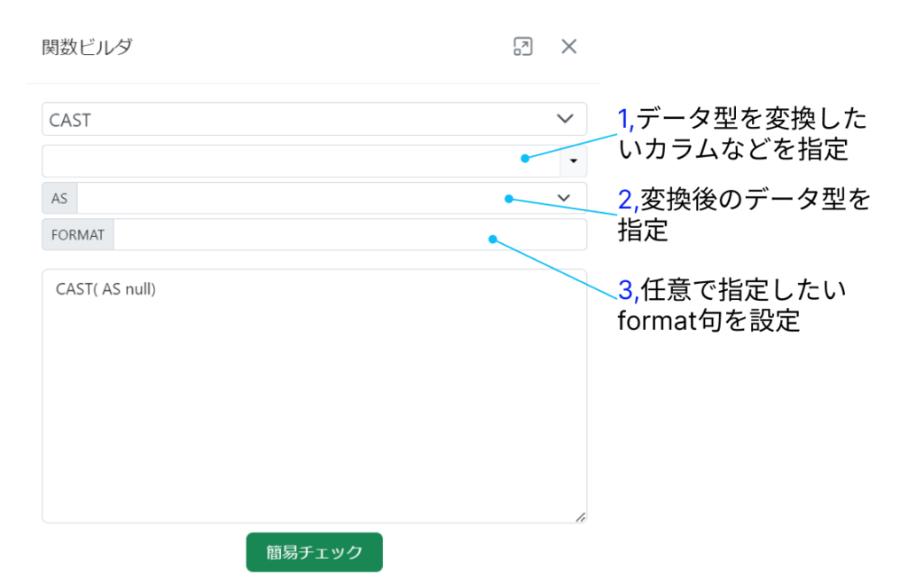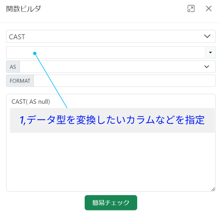 「CAST」を選択すると、下画像のように関数ビルダが立ち上がります。