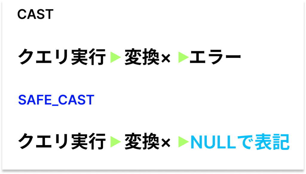 「CAST」と「SAFE_CAST」の違いとして、データを変換できない場合の処理が異なります。