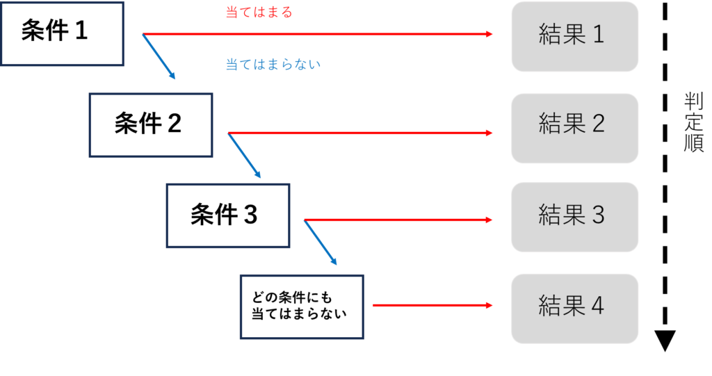 というクエリであれば、条件1に当てはまるか判定し、当てはまらない場合は条件2へ、それも当てはまらなければ条件3へ、さらに当てはまらなければ結果4へ…という順番です。