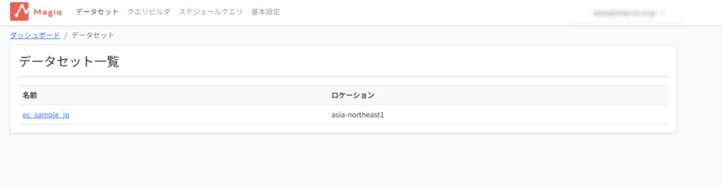 ページ上部一番左の「データセット」タブを押すと、現在BigQueryから取得されているデータセット一覧を確認することができます。