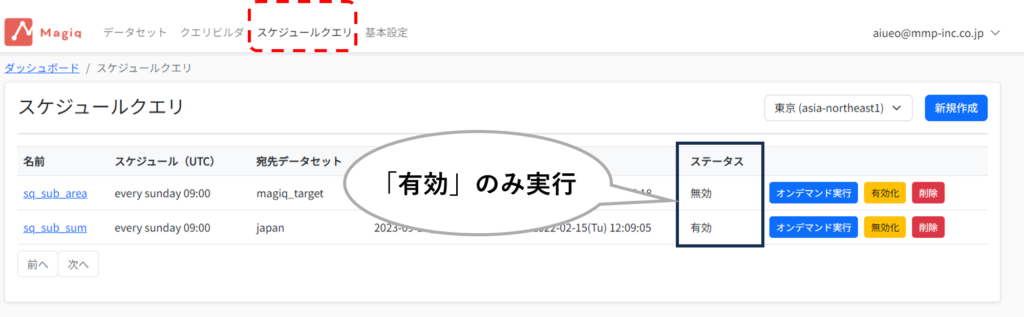 作成・登録したクエリは、「スケジュールクエリ」の一覧に表示されます。ここでは、設定スケジュール、最新更新日時、ステータスなどの情報が確認できます。ステータスが「有効」となっているクエリは、指定したスケジュールに基づいて自動実行されます。
