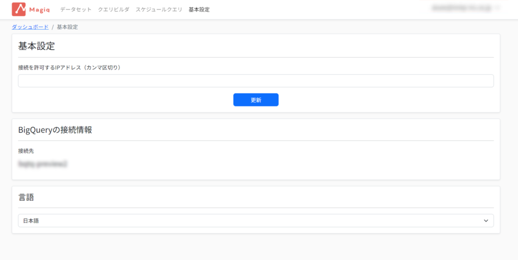 「基本設定」タブからは、接続を許可するIPアドレスの設定、BigQueryの接続先情報、言語設定などを確認することができます。